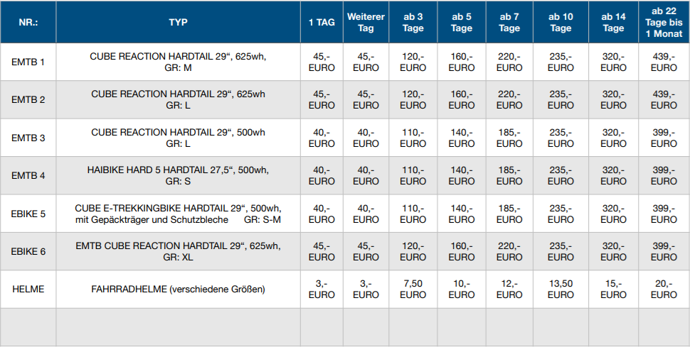 Preisliste E-Bike Verleih ab. 01.01.2026